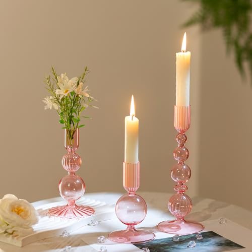 Hewory Ljushållare i rosa glas: färgglada ljusstakar dekoration ljus dekoration matbord - vintage glasljushållare för vardagsrum bröllop fest - set med 3