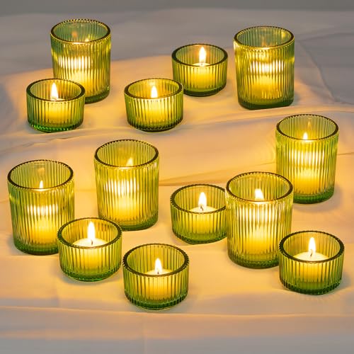 Glasseam Grönt värmeljusglas små, set med 24 ljushållare glas, vintage ljusglas värmeljusglas, räfflad värmeljushållare jul för bröllop, värmeljus glas för halloween födelsedag bordsdekoration