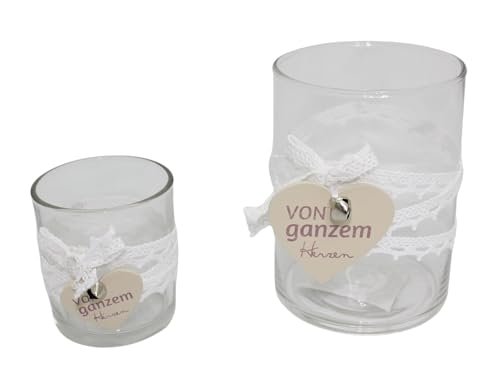 Set med 2 runda ljushållare i glas med transparent trähjärta 10 x 10 x 15 cm