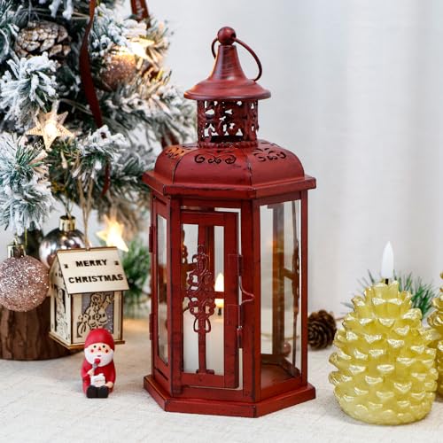 JHY DESIGN Dekorativa hängande ljuslykta, 25 cm hög, metall ljushållare med glas för inomhus, trädgård, balkong, vardagsrum (röd)