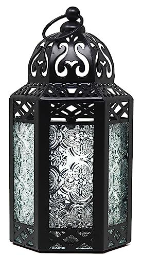 Vela Lanterns marockansk ljuslykta dekorativ ljushållare lampa för inomhus utomhus, ramadan, heminredning, uteplats, bröllop, svart metall, blått glas, medium lykta