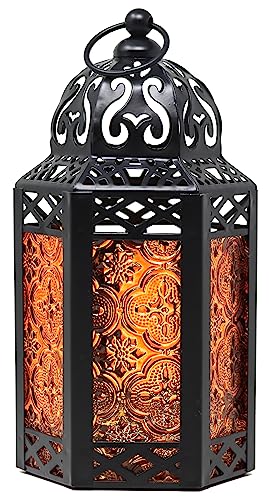 Vela Lanterns Ljuslykta i marockansk stil, dekorativa lyktor, ljushållare, lampa för inomhus- och utomhusanvändning, ramadan, heminredning, uteplats, bröllop, svart metall, bärnstensglas, medelstora