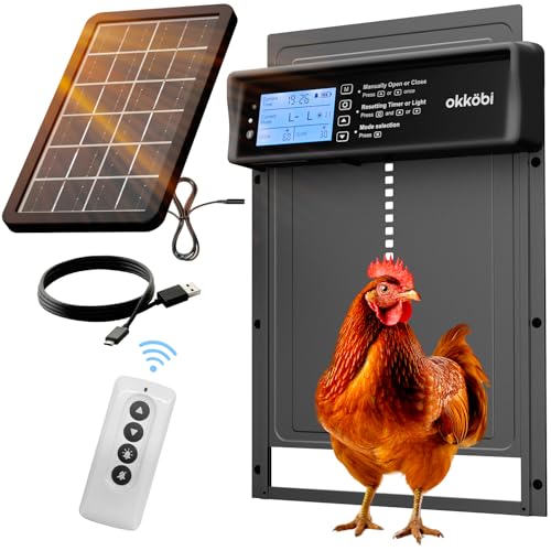 Okkobi Automatic Solar Chicken Coop Door - LCD-skärm - Fjärrkontroll, ljussensor och timer - Säkerhet och sinnesfrid: Antiklämfunktion - 5 års skydd