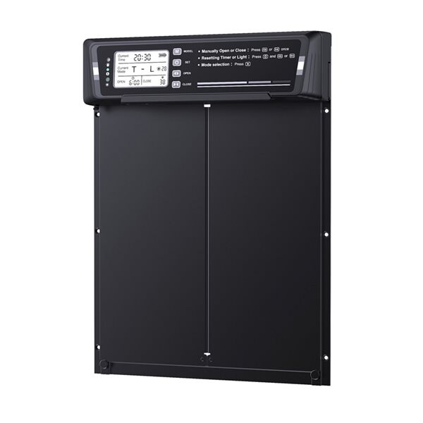 Extra stor automatisk hönshusdörr soldriven med fjärrkontroll – LCD-skärm, ljussensor, timer och anti-nypfunktion – 11,7 tum x 8,7 tum öppning – 5 års garanti – svart – av Okköbi