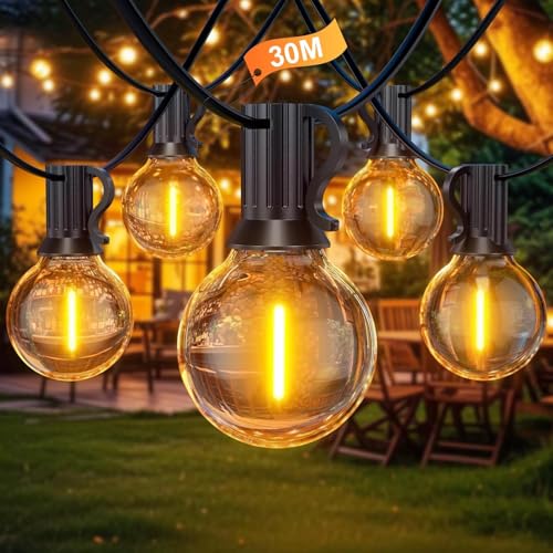 Yuusei LED-ljusslinga för utomhusbruk, 30 m, med 50 glödlampor, med fjärrkontroll, vattentät, trädgård, G40, med 2 reservglödlampor, varmvit, för fest, bröllop, terrass och inomhus