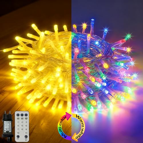 MOLVCE 10 m, 100led, varmvit och flerfärgad utomhusljusslinga med 11 lägen, fjärrkontroll, minnesfunktion och timer, julgransljus, ljusslinga för trädgård, gräsmatta