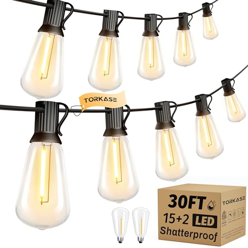 Toipwen Dimbar Utomhusljusslinga, 30m Ljusslinga med Fjärrkontroll, 50+2 Okrossbara Glödlampor, IP45 Vattentät, 2700K, Varmvit för Uteplats, Balkong, Camping, Fester