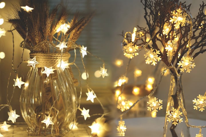 LED-ljusslinga som kan anslutas under spänning, snöflingor, varmvit, 3 m x 0,7 m, 12 remsor, IP44, för inomhus- och utomhusdekoration.