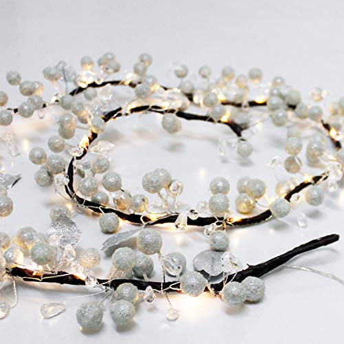 Garland med ljusslinga och timer, batteridriven, 180 cm, 35 LED varmvit för inomhusbruk, gren med silverdekoration