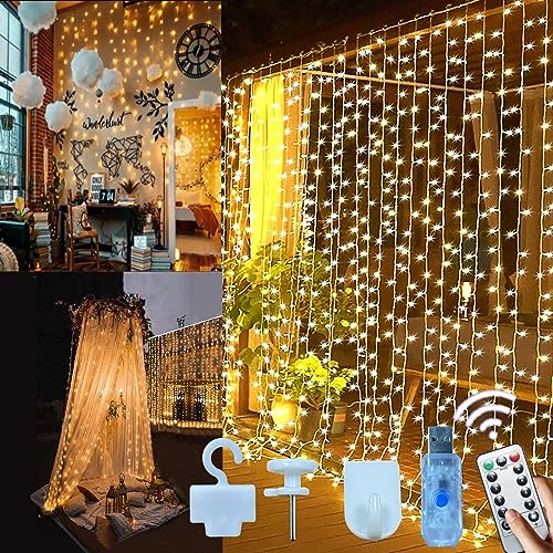 Vicloon Gardinlampor, 3 x 3 m, 300 LED, varmvit gardinljusslinga, 8 lägen, fjärrkontroll, timer, justerbar ljusstyrka, vattentät ljusslinga, USB-drift, utomhus- och inomhusbruk, sovrumsdekoration