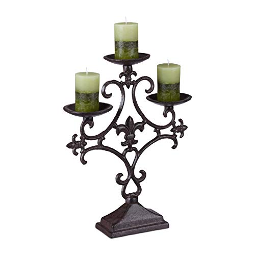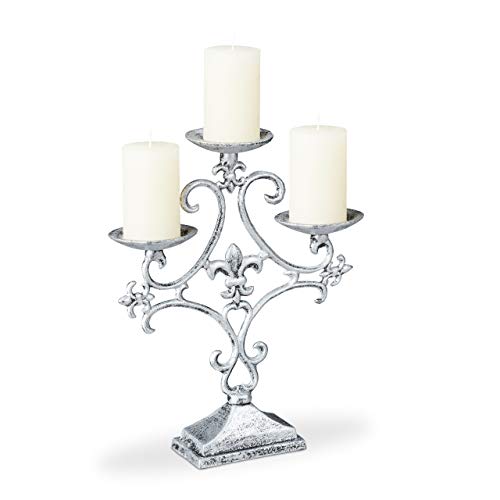 Relaxdays Ljusstake, 3-armad, ljushållare blockljus, antik, vintage, gjutjärn, HBT 28,5 x 23 x 7,5 cm, silver, 1 st