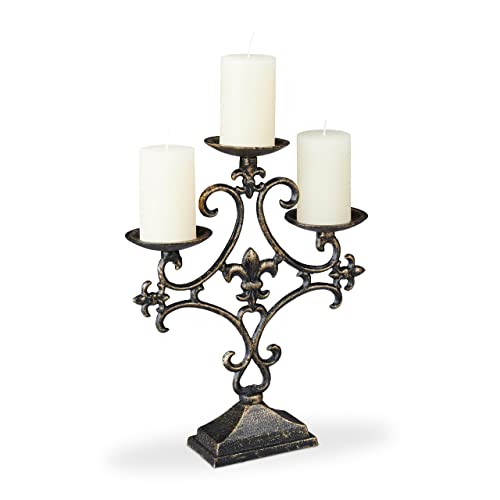 Relaxdays Ljusstake, 3-armad, ljushållare blockljus, barock, vintage, gjutjärn, HBT 28,5 x 23 x 7,5 cm, guld, 1 st