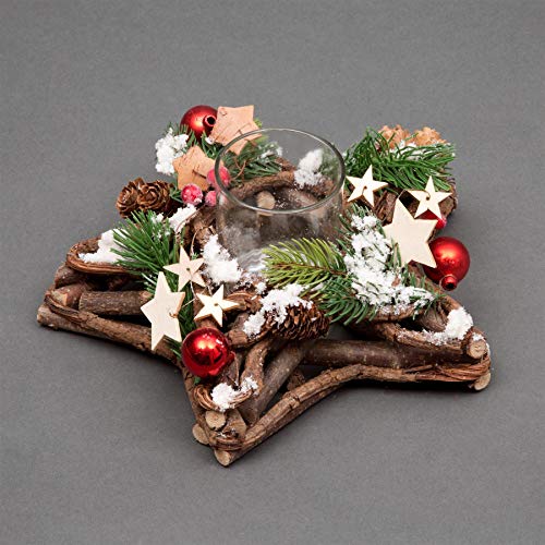 SHATCHI Stjärnformad trä ljusstake bordsskiva jullov hem dekorerat med röd/silver kulor, bär och koner (34 cm/24 cm), trä, 343410 cm
