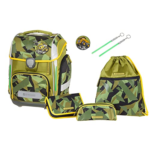 Schneiders 78387-065 – Skolväskeset konstruktion i olivgrön, för pojkar, set med 6 delar för skolstart med skolväska, pennfodral, sportväska, 2 kardborremotiv och 2 ljusstavar