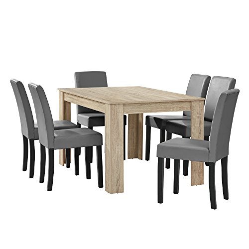 [en.casa] Matbord ek ljust med 6 stolar mörkgrå konstläder stoppat 140 x 90 ätgrupp matsal