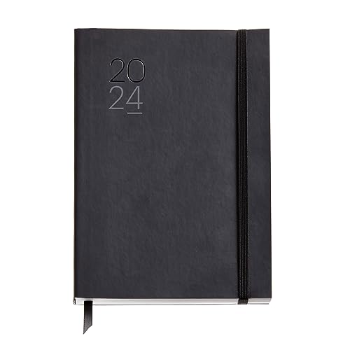 Miquelrius - Årlig dagordning 2024, Dag sida, Plus storlek 155 x 213 mm (liknande A5), Flexibelt lock läder sytt, Spanska, Engelska och portugisiska, Svart