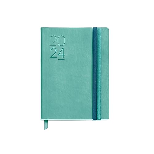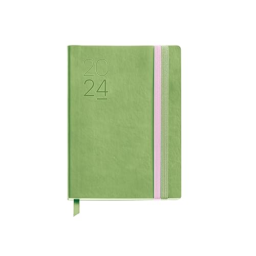 Miquelrius - Årlig dagordning 2024, Vecka Vista, Journal Storlek 122 x 168 mm, Flexibelt lock läder sytt, Dubbelt gummiband, Spanska, Engelska och Portugisiska, Grön