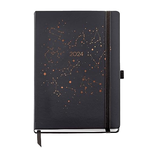 Miquelrius - Årlig agenda 2024, Dag sida, Plus storlek 155 x 213 mm (liknande A5), Hårt lock, Sy, Gummiförslutning, katalanska, engelska och portugisiska, konstellation med koppar stämpling