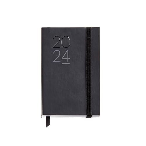 Miquelrius - Årlig dagordning 2024, Dag sida, Passport storlek 90 x 140 mm, Flexibelt lock läder sytt, katalanska, engelska och portugisiska, Svart