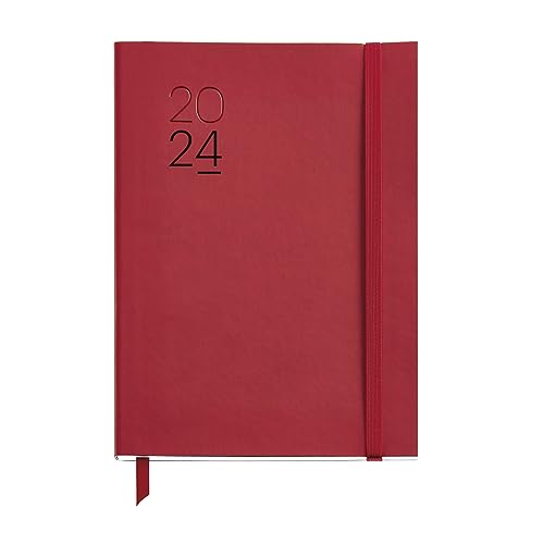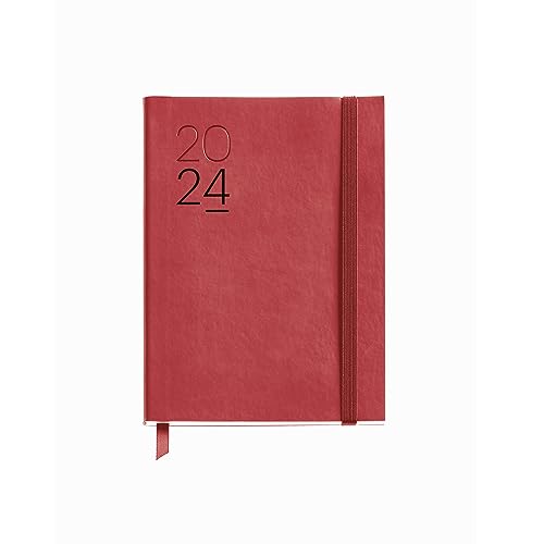 Miquelrius - Årlig dagordning 2024, Dag sida, Plus storlek 155 x 213 mm (liknande A5), Flexibelt lock läder sytt, Spanska, Engelska och portugisiska, Röd