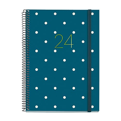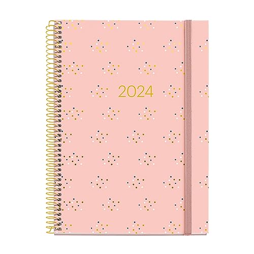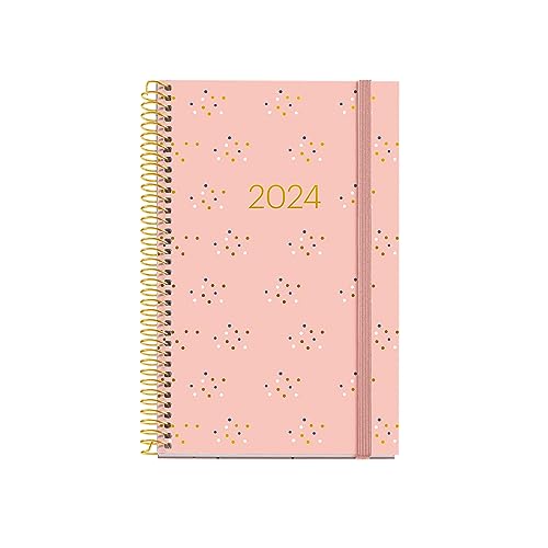 Miquelrius - Årlig agenda 2024, Vecka Vista, Plus storlek 155 x 213 mm (liknande A5), Hårt lock, Spiralbindning, Gummiförslutning, Spanska, Engelska och Portugisiska, Polka Polka med guldstämpling