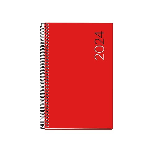 Miquelrius - Årlig agenda 2024, Veckovy Vertikal, Plus storlek 155 x 213 mm (liknande A5), Flexibelt lock polypropen, Spiralbindning, Spanska, Engelska och portugisiska, Röd