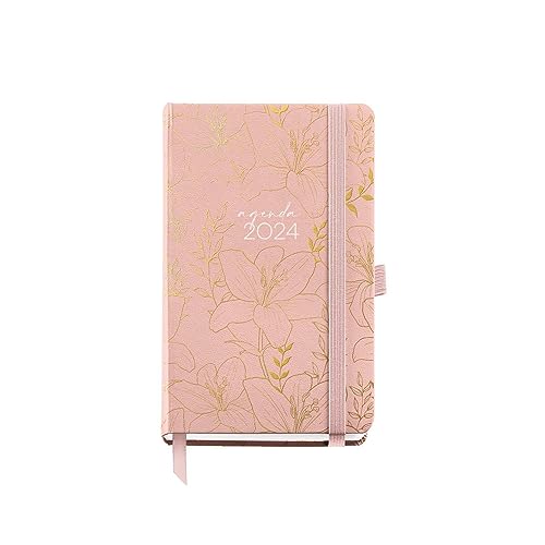 Miquelrius - Årlig agenda 2024, Dag sida, Passport storlek 90 x 140 mm, Hårt lock, sydd bindning, Gummiförslutning, Spanska, Engelska och portugisiska, Rosa med blommor i stämpling guld