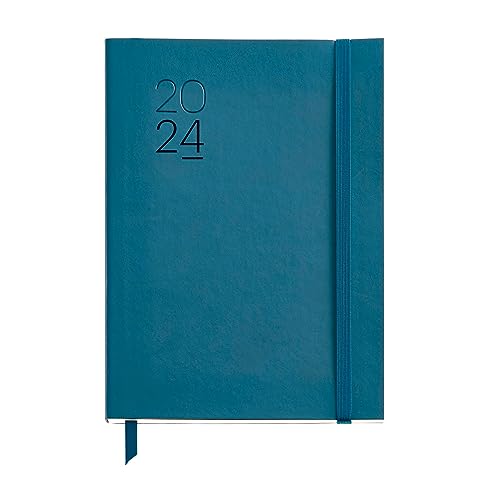 Miquelrius - Årlig dagordning 2024, Dag sida, Plus storlek 155 x 213 mm (liknande A5), Flexibelt lock läder sytt, Spanska, Engelska och portugisiska, Blå