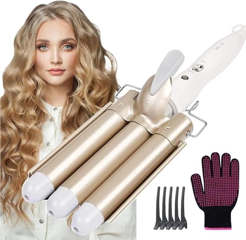 Locktång 3 fat Beach Waves Vågjärn för hår, 25 mm små lockar Keramisk locktång Temperaturinställning Snabbuppvärmning med handske, roséguld