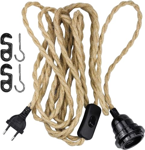 Frideko Home Kit med pendellampa med brytare, vintage-lampkabel med 4,5 m vridet hamparep, E27-sockel, plug-in, gör-det-själv- hänglampa för bondgård, hem, loft, utan glödlampa