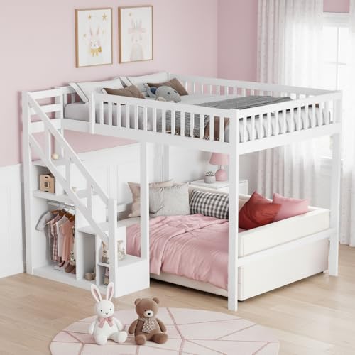 BLSYHDH Våningssäng 140 x 200 med trappa, barnsäng våningssäng med förvaringsfack barnsäng loftsäng med fallskydd och staket (vit, 140 x 200)