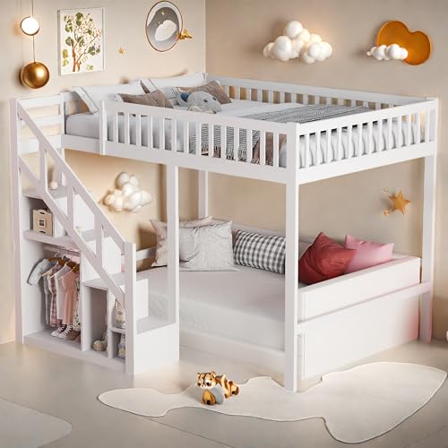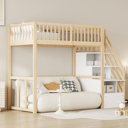 MIOOSUT Våningssäng för barn 90 x 200 med trappa, loftsäng förvaring, barnsäng med barriär, multifunktionell loftsäng, för tonåringar, utan madrass (vit, 204 x 132 x 161)