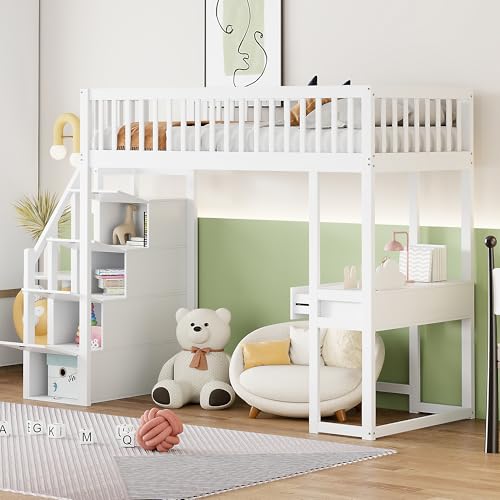 MOBETTRES Loftsäng med multifunktionsbord, säker förvaringstrappa, sängram av massiv furu för barn och tonåringar (vit, 90 x 200 cm)