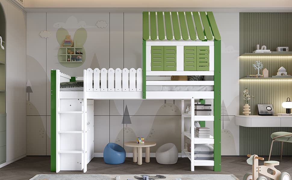 Loftsäng för barn med räcke, tak och fönster, garderob & öppna hyllor, trappa, vit/grön, 90x200 cm