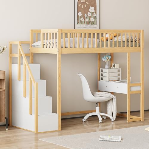 HAINEW Loftsäng, barnsäng, 90 × 200 cm med förvaringsutrymme, trappa och skrivbord, träsäng, enkelsäng, funktionell säng med ribbotten och fallskydd, för pojkar eller flickor (träfärg)