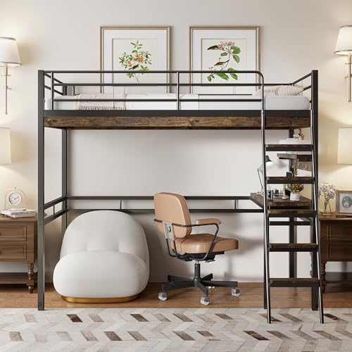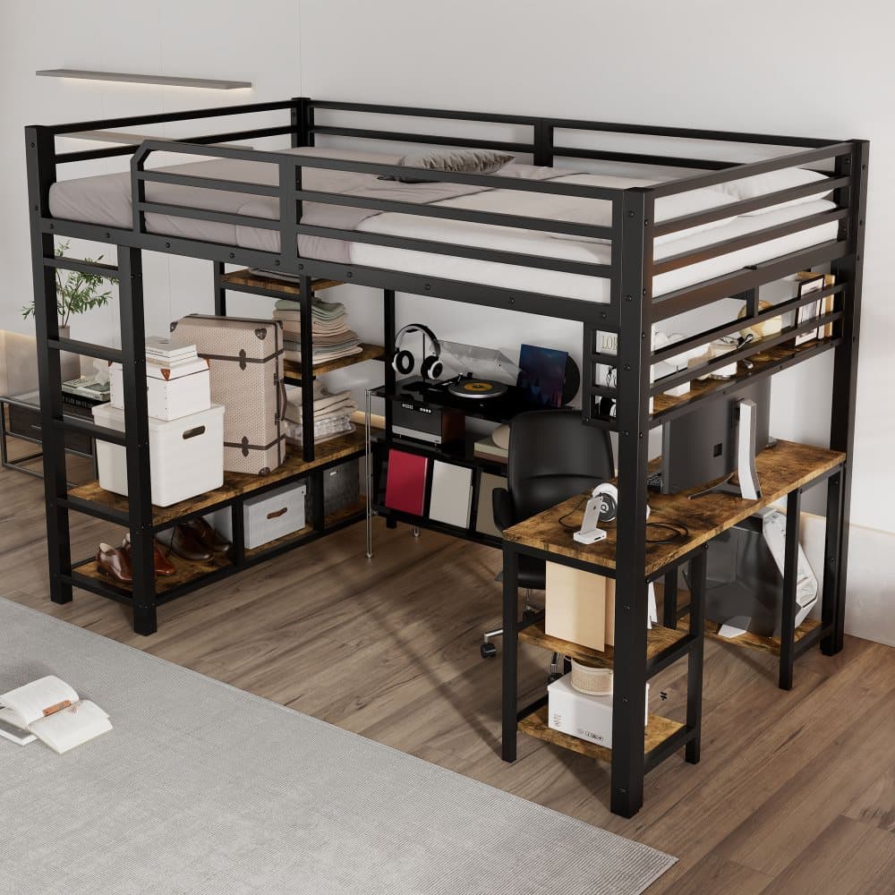 Metall loftsäng med skrivbord och avlastningshylla, stabil ribbotten, 4-stegs stege, svart/mörk, 120x200 cm