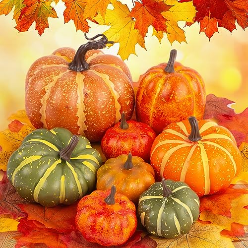 HAKACC Konstgjort pumpor-set, 7 olika falska pumpor med 30 ark konstgjorda lönnblad för thanksgiving halloween festdekoration