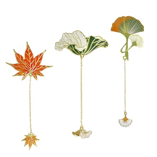 3 stycken metallbokmärken med hänge, anpassningsbara, retrostil, klassiska bladmarkeringar, lotusblad, lönnblad, ginkgobladsbokmärken, lämpliga som gåva till bokälskare