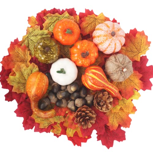 POPOYU 123 st höstpumpor dekorationer höstdekor konstgjord pumpa set med skörd pumpa, tallkottar, lönnblad, små ekollon, kalebass för höst, bröllop, halloweenfest bordsdekor
