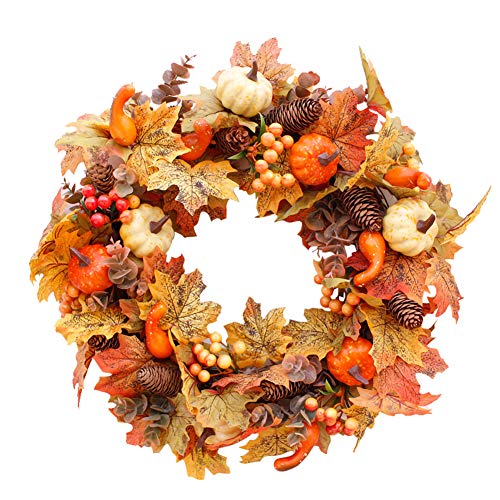 Höstkransar för ytterdörren 20 tum konstgjord julkrans dekor höst skörd kransar med pumpa-lönnblad och bär för halloween påsk skördefest, interiör huvuddekoration