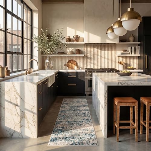 QQrunner Matta löpare hall grå och blå halkfri 90 x 500 cm köksmatta lapptäcke tvättbar metervara sovrum korridor matta lång, justerbar längd 40–120 cm bred