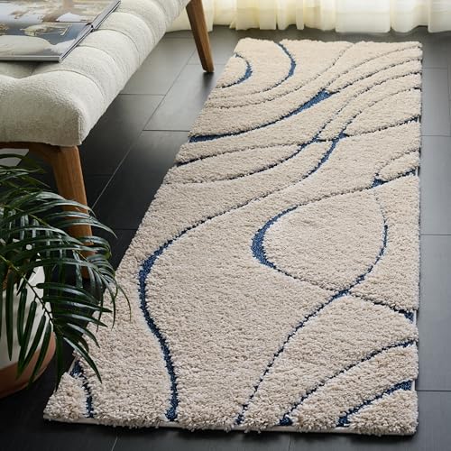 SAFAVIEH Florida Shag-kollektion 60 cm x 180 cm kräm/blå SG471 abstrakt våg fäller ej vardagsrum sovrum matsal entré plysch 3 cm tjock löpare matta