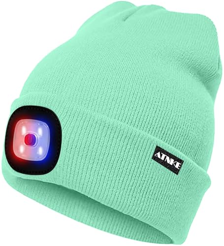 ATNKE Unisex LED-mössa med ljus, uppladdningsbar USB 4 LED-upplyst löparmössa, extremt ljus lampa, vinter, varm stickad mössa för män och kvinnor, presenter, Skuggblå, En Storlek