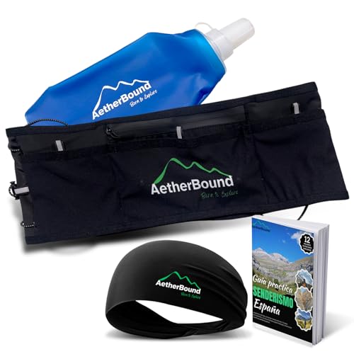 Löpbälte + mjuk flaska 500 ml + svettband + present e-bok, löpbälte för män och kvinnor med bärare, löpband med käppar, justerbar lätt och robust, svart, XS/S/M, Löpbälte med praktiska fickor