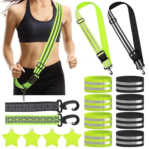 XINRANFF 16 reflektorer klädset, 2 reflektorbälten justerbara, 8 elastiska reflektorband, 4 reflektorhängen, 6 reflektorhängningar, löpbälte för barn och vuxna, cykling, jogging