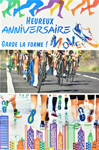 Lyckokort till födelsedagen, blå, glänsande, multisport, fysikform, löpning, marahton, basket, sko, racercykel, cykelsport, stad, tillverkad i Frankrike