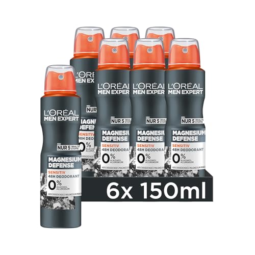 L'Oréal Män Expert 48H Sensitiv deodorantspray för män, kroppsspray mot svettlukt, svettning och underarmvätta, män antiperspirant utan alkohol och aluminium, magnesium Defense, 6 x 150 ml
