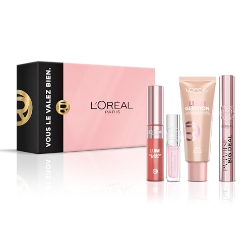 L'Oréal Paris bästsäljare Glow presentset: Lash Paradise Mascara, Lumi Glotion i 903 Medium, Plump In läppglans i 400 & lyxig skönhetspåse, för strålande skönhet och glamorös glans, 4-delar