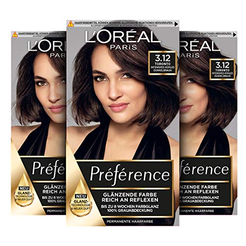 L'Oréal Paris permanent hårfärg, hårfärgningsset med färg och färgglans vård balsam, préférence, 3,12 intensiv sval mörkbrun, set om 3