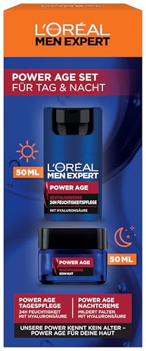 L'Oréal Män Expert vårdset mot rynkor för män, presentset med anti-aging dagkräm och nattkräm mot matt hud, presenter till män med hyaluronsyra, Power Age, 2 x 50 ml